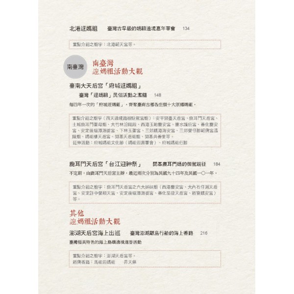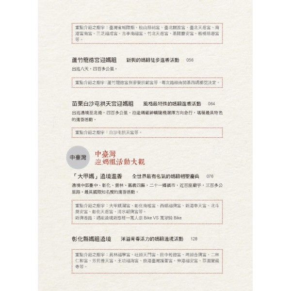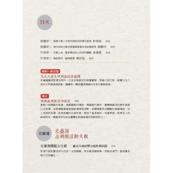 1. 台灣俗諺「三月瘋媽祖」,可說是每年農曆三月台灣各地媽祖廟信徒迎媽祖盛事的最佳寫照,並且點出了媽祖廟是台灣宗教中最普遍的信仰之一,可考的信仰圈傳播甚至遠抵非洲,無遠弗屆。本書所精挑介紹迎媽祖活動中繞境香路的各地香火鼎盛,並具文化資產性與歷史意義的寺廟。